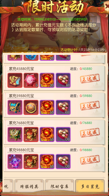 活动期间累计充值元宝数(不包含赠送部分)达到指定数量时,可领取对应的活动奖励: