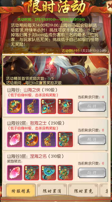 每天14:00和19:00,山海谷各层均会刷新活动精英,挑战可以获得丰厚奖励!