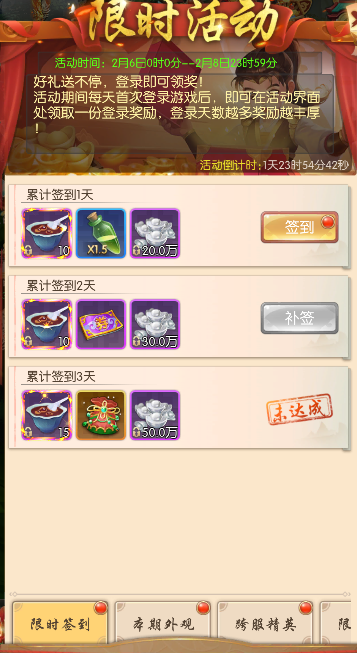 每天首次登录游戏后,即可在活动界面处领取一份登录奖励,登录天数越多奖励越丰厚。