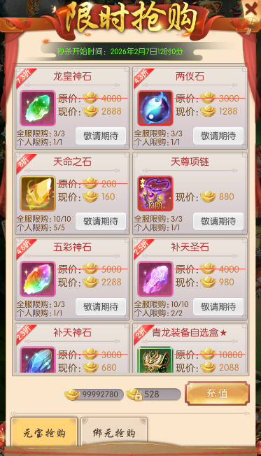 活动期间,可用元宝或绑元限时抢购各种珍贵道具,数量有限,各位少侠千万不要错过!