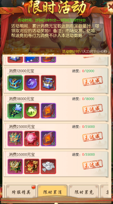 活动期间,累计消费元宝数达到指定数量时,可领取对应的活动奖励!