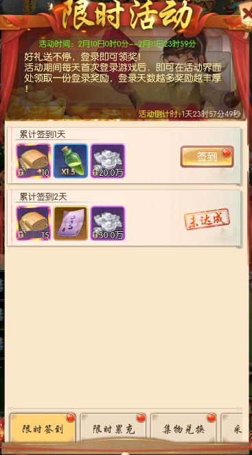 每天首次登录游戏后,即可在活动界面处领取一份登录奖励,登录天数越多奖励越丰厚。