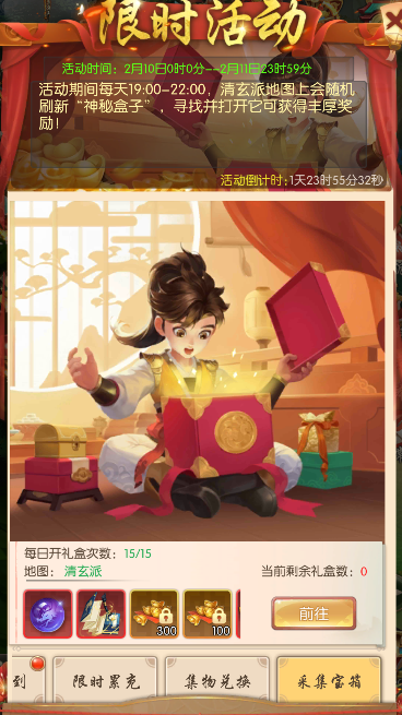 每天19:00-22:00清玄派地图会刷新神秘盒子,寻找并打开神秘盒子可获得丰厚奖励;