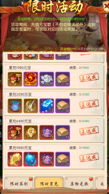 每日累计充值元宝数(不包含赠送部分)达到指定数量时,可领取对应的活动奖励。