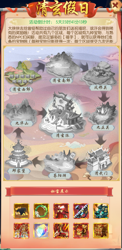 活动期间共有九片区域,每个区域有九种宝物,与熟悉的NPC们闲聊,提交足够多的【福字】,就可以获得他们准备好的宝物喔!