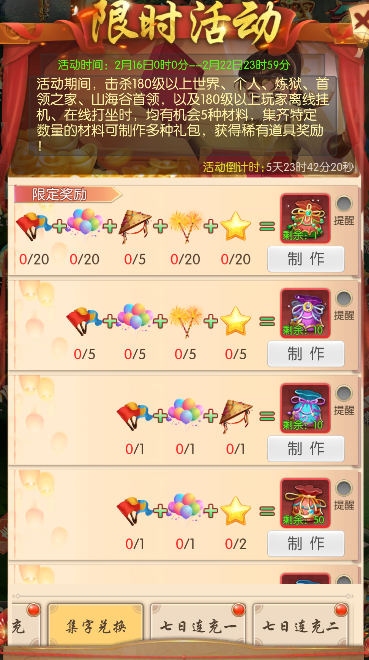击杀180级以上世界首领、个人首领、炼狱首领、首领之家首领,或180级以上玩家进行离线挂机、在线挂机等均有机会额外获得【万能材料包】,可在限时兑换中兑换丰厚奖励。