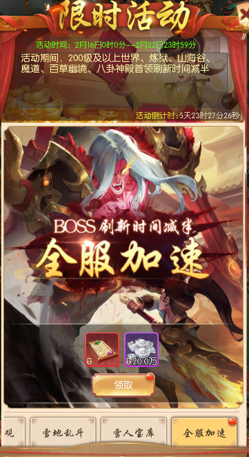 活动期间,200级及以上世界、炼狱、山海谷、魔道、百草幽境、八卦神殿首领刷新时间减半。