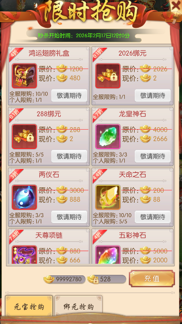 活动期间,可用元宝或绑元限时抢购各种珍贵道具,数量有限,各位少侠千万不要错过!