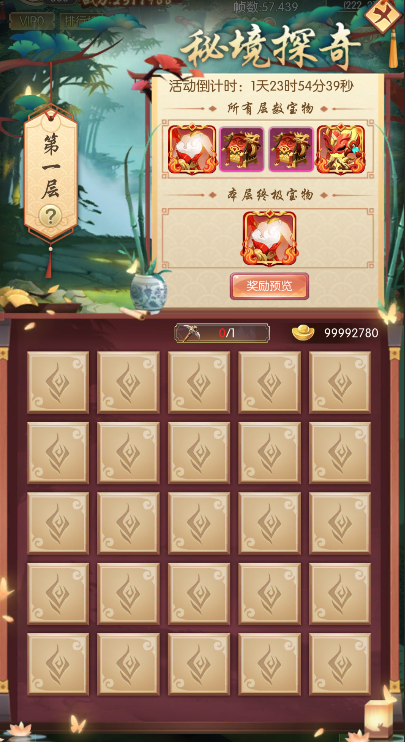 3、每一层都有普通奖励、稀有奖励、终极宝物三类,所有奖励均为固定,如果在本层挖宝25次必然获得本层所有奖励,可点击【本层奖励预览】查看奖励内容和剩余份数。