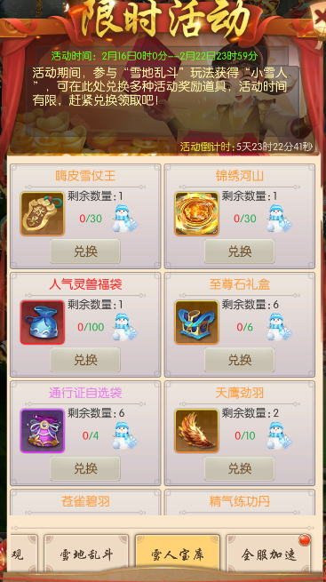 活动期间,参与“雪地乱斗”玩法获得“小雪人”,可在此处兑换多种活动奖励道具。活动时间有限,赶紧兑换领取吧!