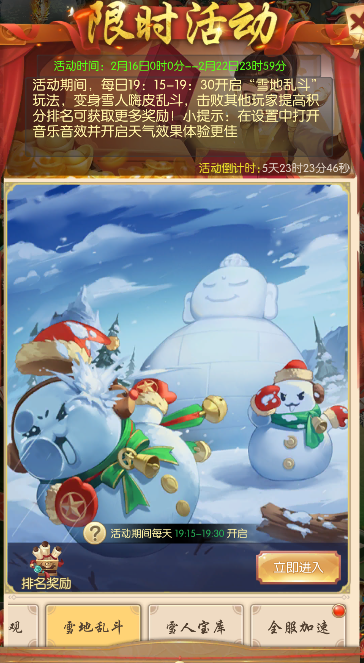 活动期间,每日19:15-19:30开启“雪地乱斗”玩法,变身雪人嗨皮乱斗,击败其他玩家提高积分排名可获取更多奖励!