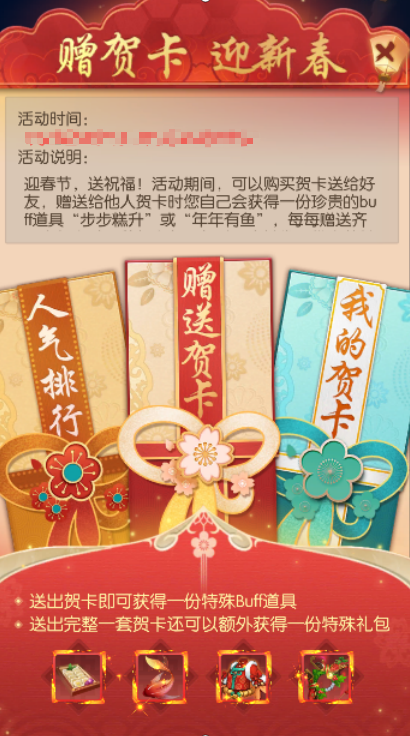 活动期间,可以购买贺卡送给好友,赠送给他人贺卡时您自己会获得一份珍贵的buff道具“步步糕升”或“年年有鱼”,每每赠送齐一套贺卡(四种贺卡各一)时,会触发一份春节外观奖励!此外,接收他人赠予的贺卡也可触发集卡成就,领取好礼哦!