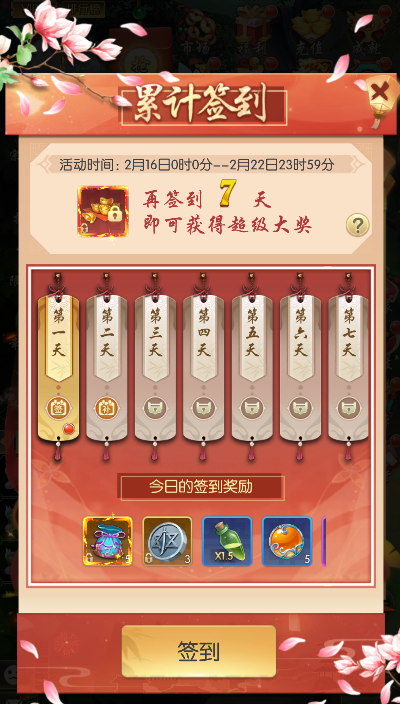 l 活动期间,每日登录之后可以进行签到,每次签到即可领取一份奖励;