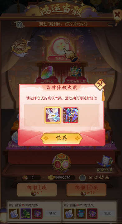 l 掷出鸿运骰,根据朝上的颜色可获得对应颜色的随机大奖;