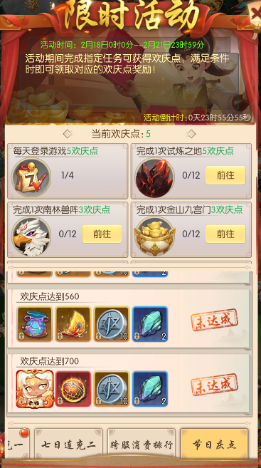 活动期间完成指定任务可获得欢庆点,满足指定条件时即可领取对应的欢庆点奖励!