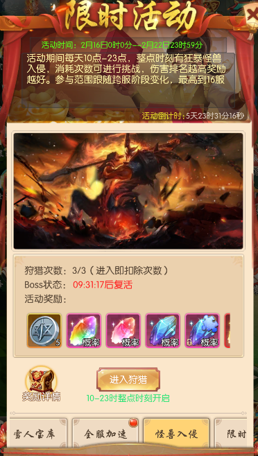 活动期间每天10点-23点,整点时刻有狂暴怪兽入侵,消耗次数可进行挑战,伤害排名越高奖励越好。排名参与范围跟随跨服阶段变化,最高可到16服!
