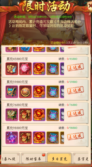 活动期间累计充值元宝数(不包含赠送部分)达到指定数量时,可领取对应的活动奖励: