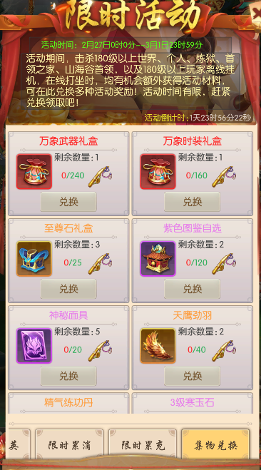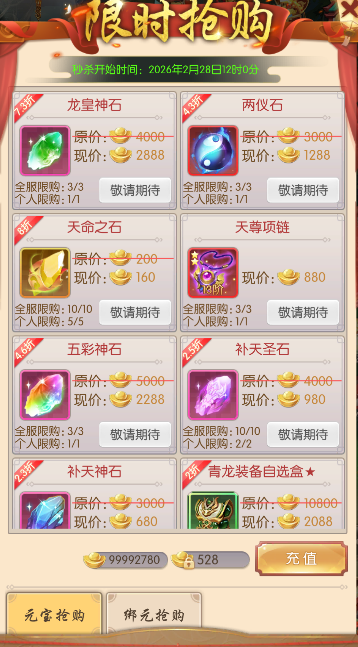 活动期间,可用元宝或绑元限时抢购各种珍贵道具,数量有限,各位少侠千万不要错过!