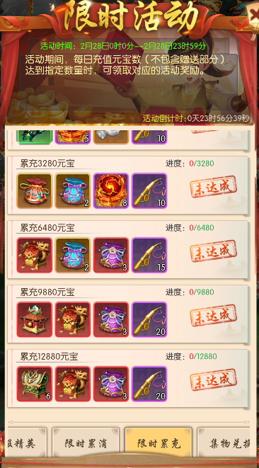 每日累计充值元宝数(不包含赠送部分)达到指定数量时,可领取对应的活动奖励。