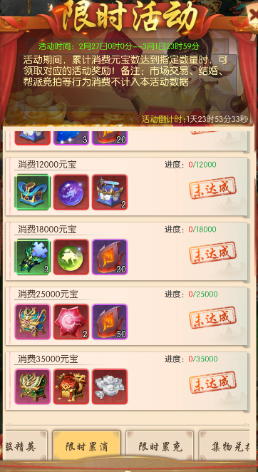 活动期间,累计消费元宝数达到指定数量时,可领取对应的活动奖励!