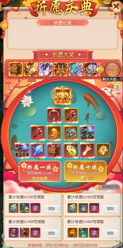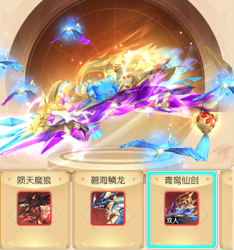 少侠可通过祈愿有机会获得珍品魂灵【将虎魂灵】,大坐骑【陨天魔狼】、【碧海鳞龙】、【青鸾仙剑】,以及限定翅膀化形【尚鸟古羽】!此外,累计奖励奖励多多,少侠切勿错过!