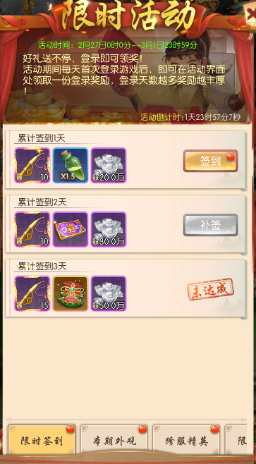 每天首次登录游戏后,即可在活动界面处领取一份登录奖励,登录天数越多奖励越丰厚。