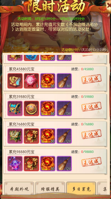 每日累计充值元宝数(不包含赠送部分)达到指定数量时,可领取对应的活动奖励。