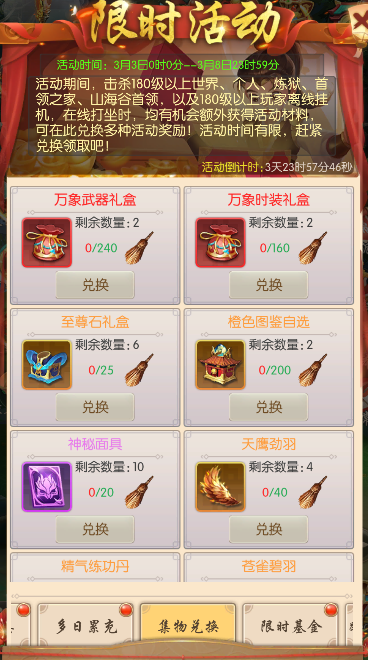 击杀180级以上世界首领、个人首领、炼狱首领、首领之家首领,或180级以上玩家进行离线挂机、在线挂机等均有机会额外获得【扫帚】,可在限时兑换中兑换丰厚奖励。