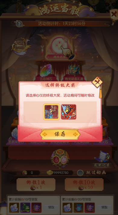 l 掷出鸿运骰,根据朝上的颜色可获得对应颜色的随机大奖;