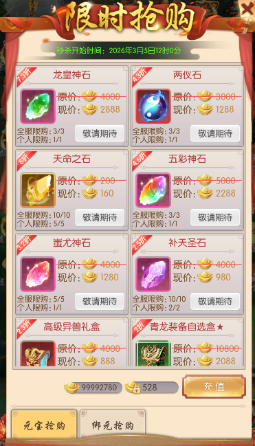 活动期间,可用元宝或绑元限时抢购各种珍贵道具,数量有限,各位少侠千万不要错过!