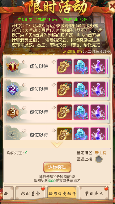 l 消费达5000元宝可参与排名,排行榜每10分钟刷新1次;