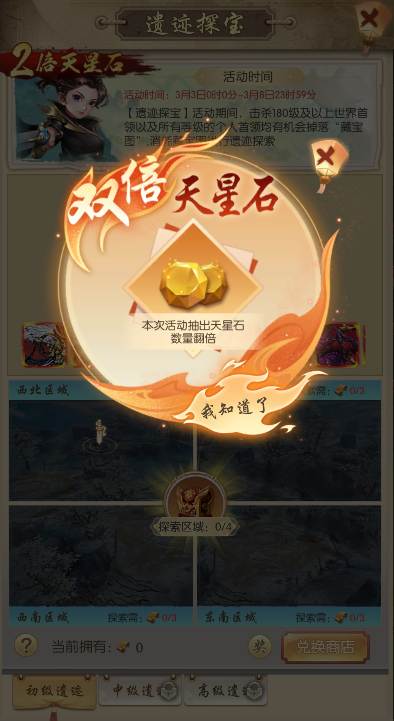l 探索遗迹有几率可获得天星石,可在兑换商店中兑换道具;