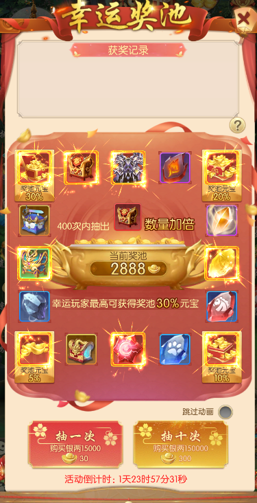 投入元宝进行招财猫祈福,将会获得一定倍数的招财猫奖励,最高可获得3倍奖励;多倍返元宝,稳赚不赔!