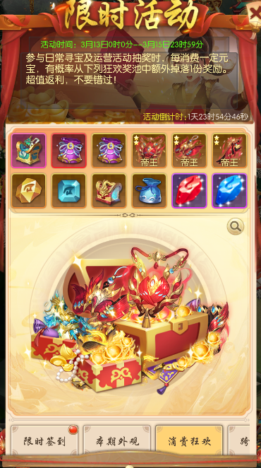 活动期间,参与日常寻宝及运营活动抽奖时,每消费一定元宝,有概率从狂欢奖池中额外获得一份奖励掉落,超值返利,不要错过!
