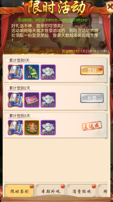 每天首次登录游戏后,即可在活动界面处领取一份登录奖励,登录天数越多奖励越丰厚。