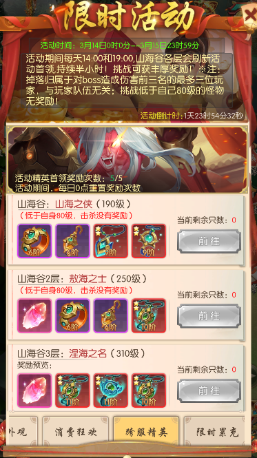 每天14:00和19:00,山海谷各层均会刷新活动精英,挑战可以获得丰厚奖励!