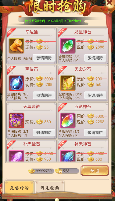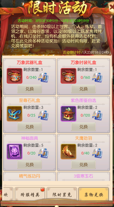 活动期间,可用元宝或绑元限时抢购各种珍贵道具,数量有限,各位少侠千万不要错过!