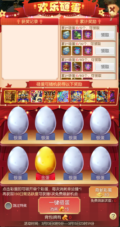 欢乐砸蛋,限时夺宝,欢乐升级!少侠可通过砸蛋有机会获得大坐骑【北冥之鲲】、【铁甲熊王】、【重明鸟】、以及神功化形【宝葫还魂诀】、魂灵【鸿鹤魂灵】!此外,累计奖励奖励多多,少侠切勿错过!