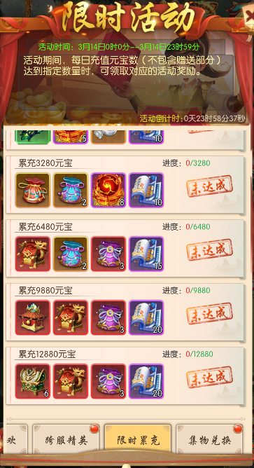 每日累计充值元宝数(不包含赠送部分)达到指定数量时,可领取对应的活动奖励。