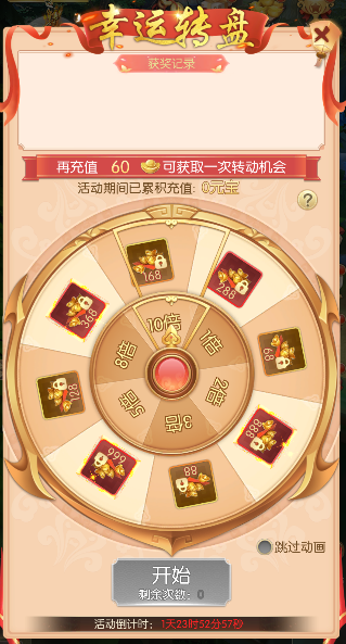每充值达到一定额度,即可获赠一次抽取幸运转盘的机会!抽取幸运转盘,获得绑元奖励,更有奖励倍数可以抽取!150级及以上少侠方可参与该活动哦!