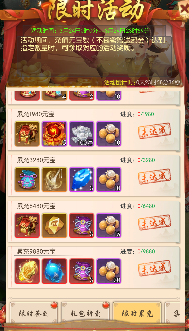 每日累计充值元宝数(不包含赠送部分)达到指定数量时,可领取对应的活动奖励。