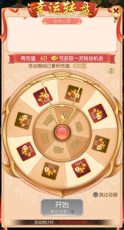 活动期间,每充值达到一定额度,即可获赠一次抽取幸运转盘的机会!抽取幸运转盘,获得绑元奖励,更有奖励倍数可以抽取!150级及以上少侠方可参与该活动哦!