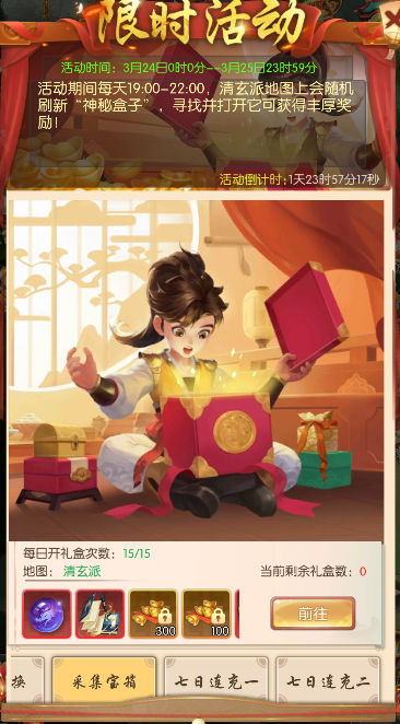 每天19:00-22:00清玄派地图会刷新神秘盒子,寻找并打开神秘盒子可获得丰厚奖励;