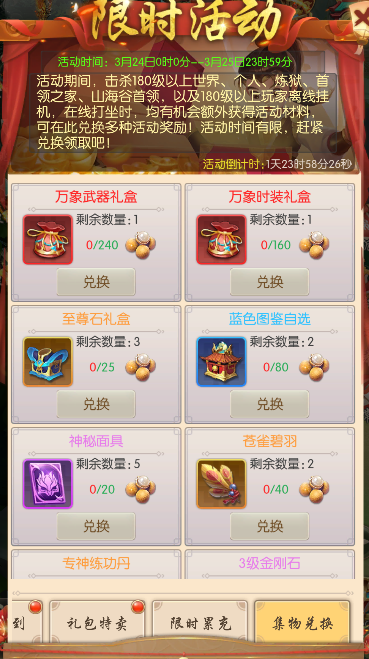 击杀180级以上世界首领、个人首领、炼狱首领、首领之家首领,或180级以上玩家进行离线挂机、在线挂机等均有机会额外获得活动道具【龙眼】,可在限时兑换中兑换丰厚奖励。