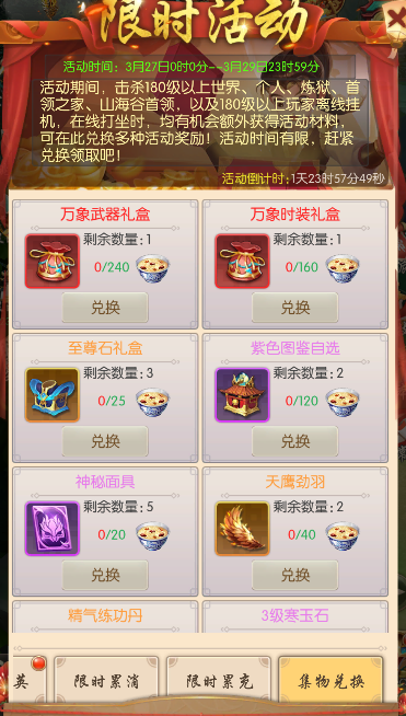 击杀180级以上世界首领、个人首领、炼狱首领、首领之家首领,或180级以上玩家进行离线挂机、在线挂机等均有机会额外获得冰糖雪梨活动道具,可在限时兑换中兑换丰厚奖励。