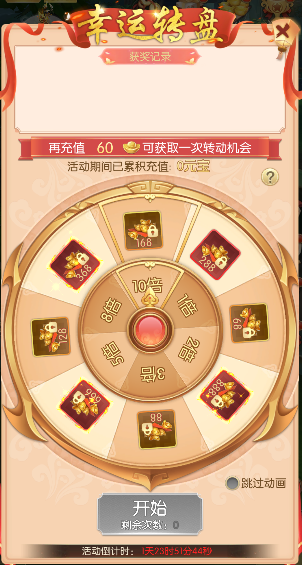每充值达到一定额度,即可获赠一次抽取幸运转盘的机会!抽取幸运转盘,获得绑元奖励,更有奖励倍数可以抽取!150级及以上少侠方可参与该活动哦!