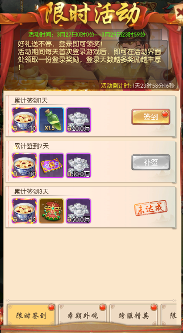每天首次登录游戏后,即可在活动界面处领取一份登录奖励,登录天数越多奖励越丰厚。