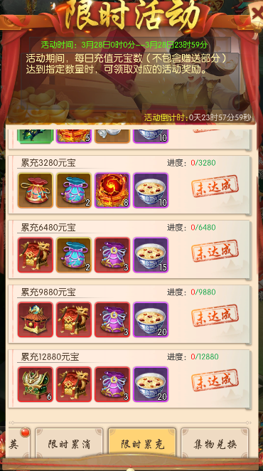 每日累计充值元宝数(不包含赠送部分)达到指定数量时,可领取对应的活动奖励。