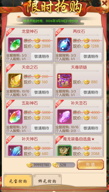 活动期间,可用元宝或绑元限时抢购各种珍贵道具,数量有限,各位少侠千万不要错过!