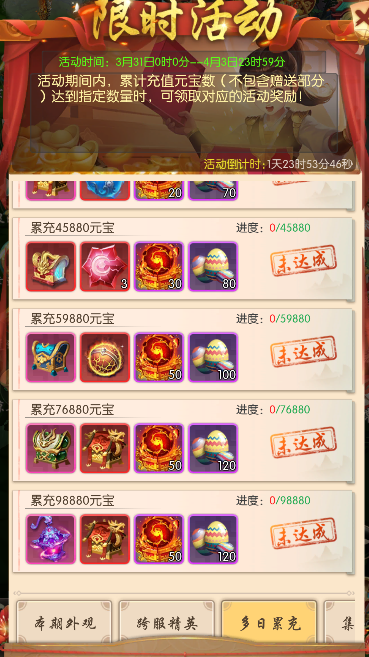每日累计充值元宝数(不包含赠送部分)达到指定数量时,可领取对应的活动奖励。